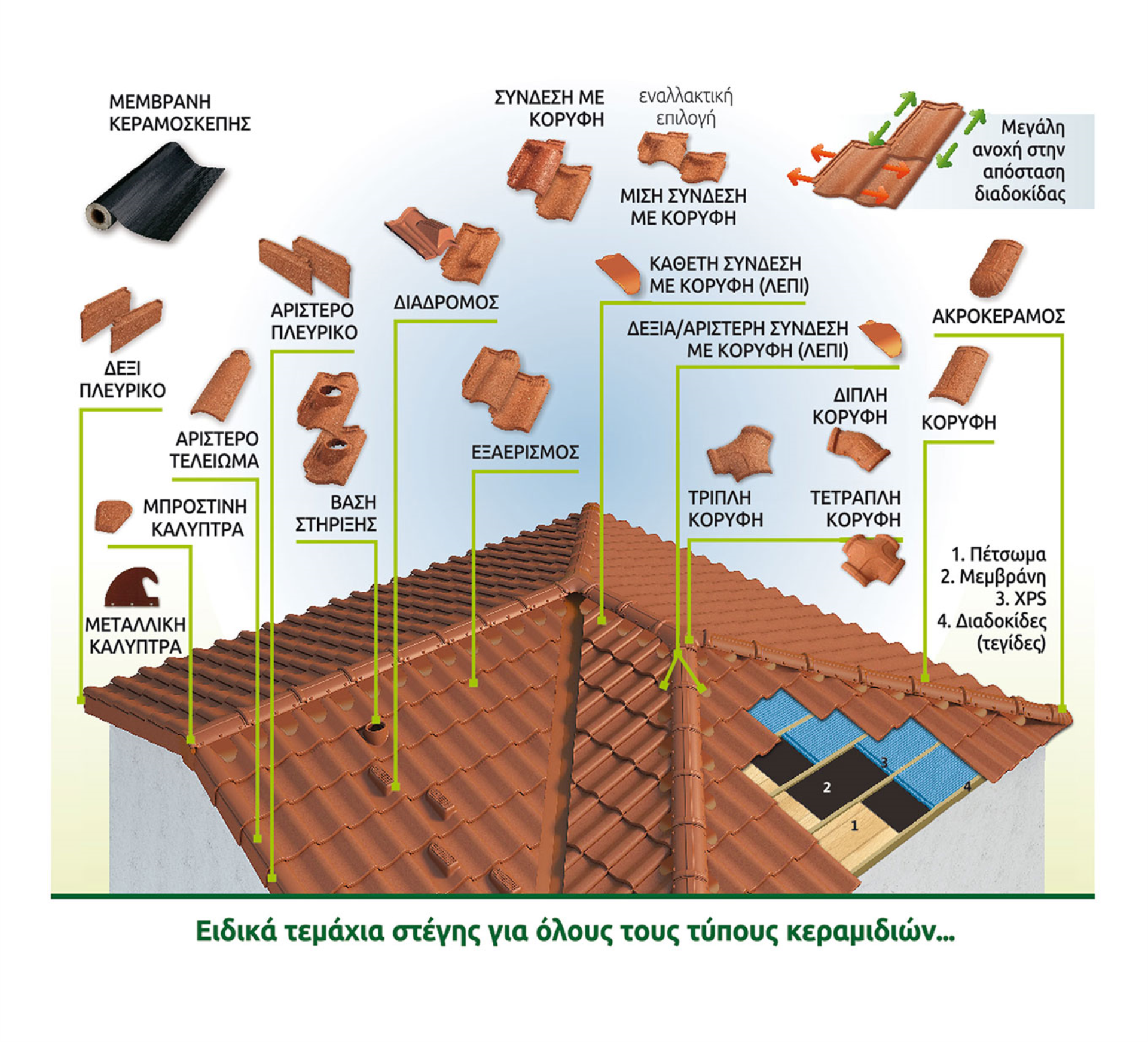Προσφέρουμε όλα τα ΕΙΔΙΚΑ ΤΕΜΑΧΙΑ ΚΕΡΑΜΙΔΙΩΝ που αντιστοιχούν σε κάθε τύπο κεραμιδιού έτσι ώστε να δημιουργείται ασφάλεια, αντοχή και καλαισθησία στην στέγη σας.