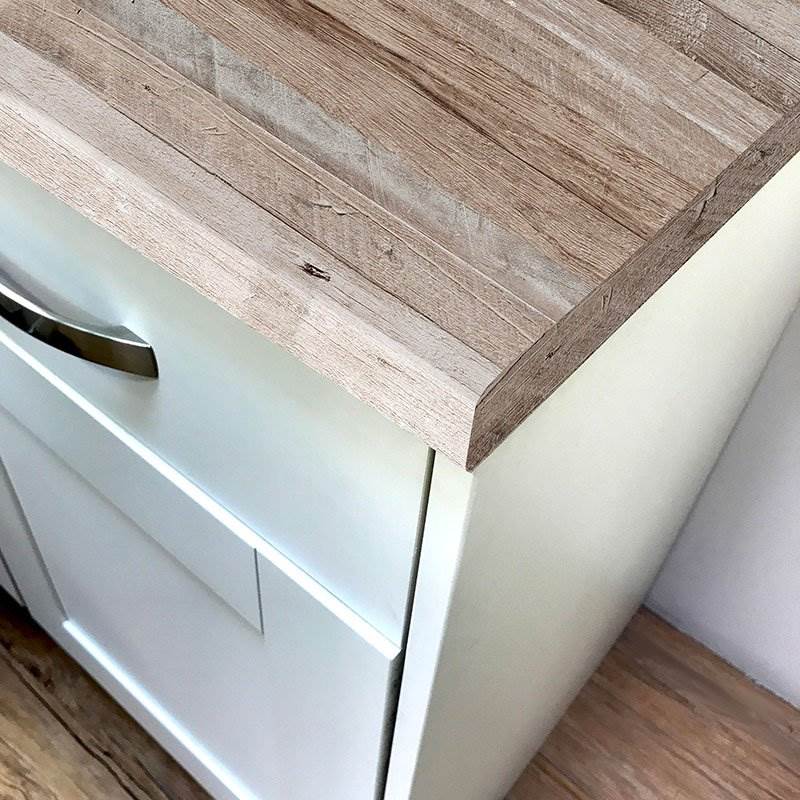 Αποτελείται από εσωτερικό πυρήνα με ενισχυμένη μοριοσανίδα (νοβοπάν), που το επικαλύπτει διακοσμητικό laminate film, υψηλής πίεσης (HPL), με ντεκόρ απομίμηση πάνελ ξύλο δρυς χρώματος μπεζ – καφέ με λευκές αποχρώσεις. Το μπροστινό μέρος του είναι ενισχυμένο με ειδική λωρίδα ινοσανίδας HDF. Ειδική λωρίδα σιλικόνης είναι τοποθετημένη κάτω από τη διαμορφωμένη άκρη σε όλο το μήκος του πάγκου κουζίνας. Σχηματίζει έτσι ένα φράγμα για τις σταγόνες και κρατά το νερό μακριά.