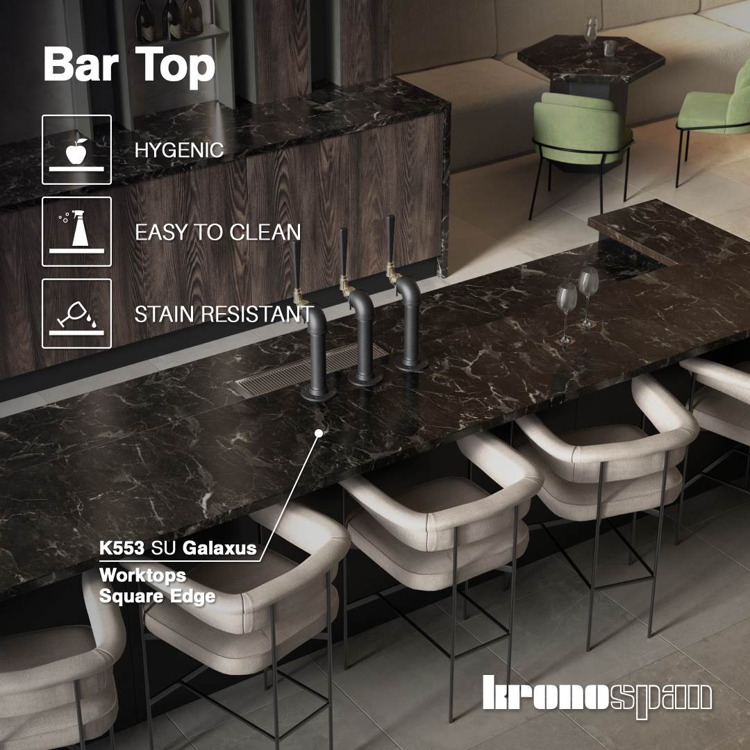 Ο ΠΑΓΚΟΣ ΚΟΥΖΙΝΑΣ SLIM LINE COMPACT KRONOSPAN K553 SU Galaxus, είναι απομίμηση μάρμαρο χρώματος ανθρακί, ιδανικός για υψηλής αισθητικής κουζίνες, νησίδες κουζίνας, γραφεία, ντουλάπες, έπιπλα και κατασκευές εσωτερικής διακόσμησης σε σπίτια, καταστήματα, αθλητικά συγκροτήματα, εργαστήρια, σχολεία, νοσοκομεία στη ναυπηγική και λοιπές χρήσεις. Είναι καινοτόμο υλικό, ταιριάζει σε όλα τα στυλ διακόσμησης και design, γι’ αυτό και χρησιμοποιείται με μεγάλη επιτυχία τόσο σε μοντέρνες όσο και σε κλασικές κατασκευές.